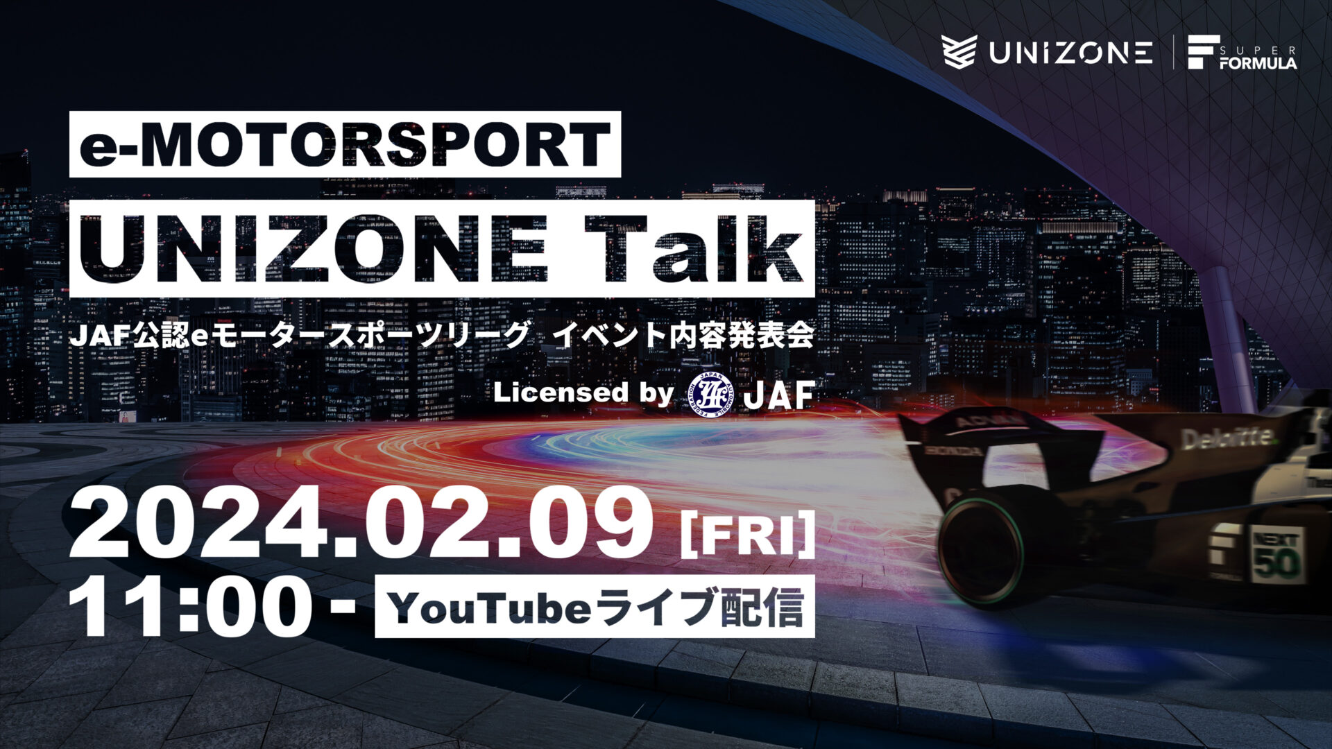 「UNIZONE」初となる一般公開イベント「UNIZONE EX Match ~ Powered by SUPER FORMULA ~」のイベント詳細を2月9日の「UNIZONE Talk」にて発表予定