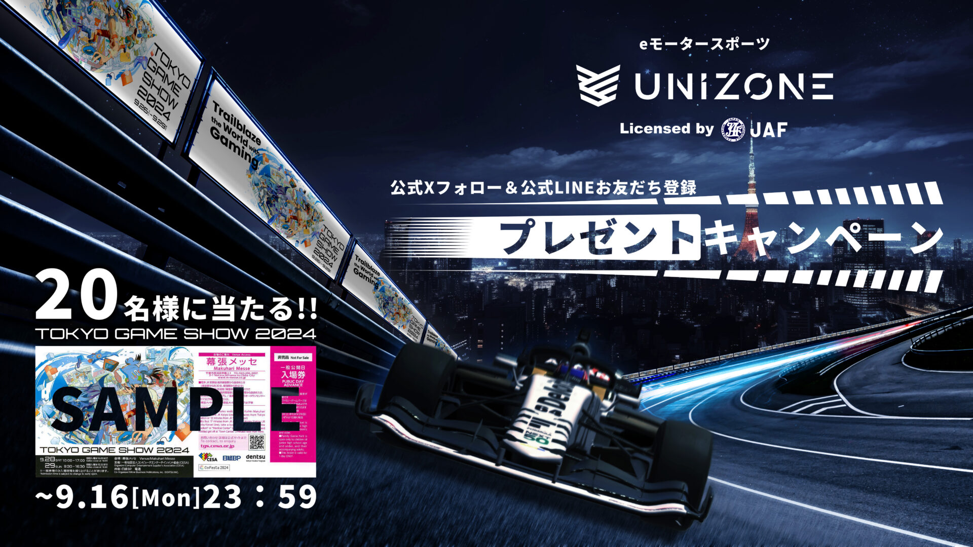 国内で唯一JAF(日本自動車連盟)の公認を受けたeモータースポーツ大会(レーシングゲームを使用したeスポーツ大会)「UNIZONE(ユニゾーン)」を運営する一般社団法人日本eモータースポーツ機構(東京都千代田区、代表理事:出井宏明、以下「JeMO」)は、2024年9月26日(木)から29日(日)に幕張メッセで開催される「TOKYO GAME SHOW 2024」へのUNIZONEブース出展を記念し、公式Xフォロー&公式LINEお友だち登録プレゼントキャンペーンを実施、キャンペーン内容を発表します。
