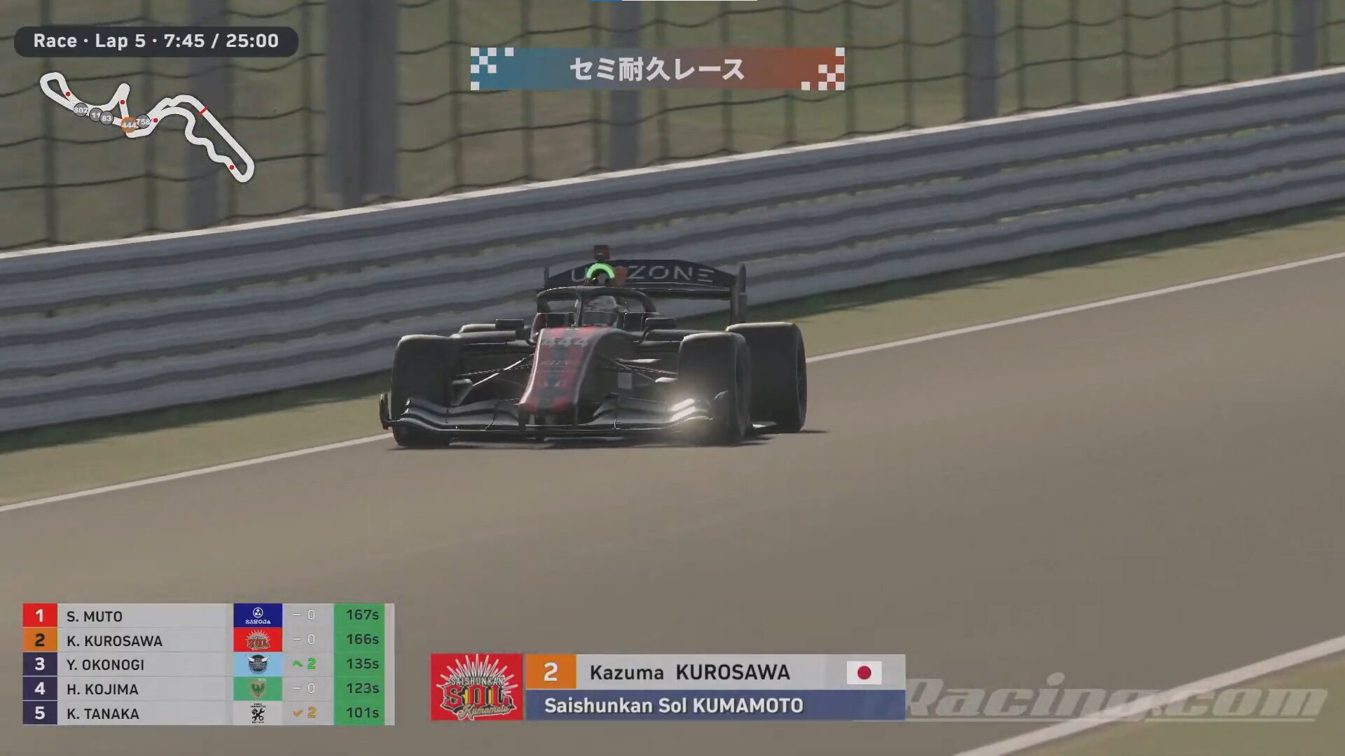 そんな波乱の1周目、9番グリッドからスタートした小此木選手がデグナーまでに驚異の6台をオーバーテイクし、3位まで一気に浮上。得意のSUPER FORMULAで大量ポイント獲得を狙います。さらに実車経験豊富な木村選手も、堅実な走りで5位に浮上するなど、経験の豊富なドライバーの力が光る展開となりました。